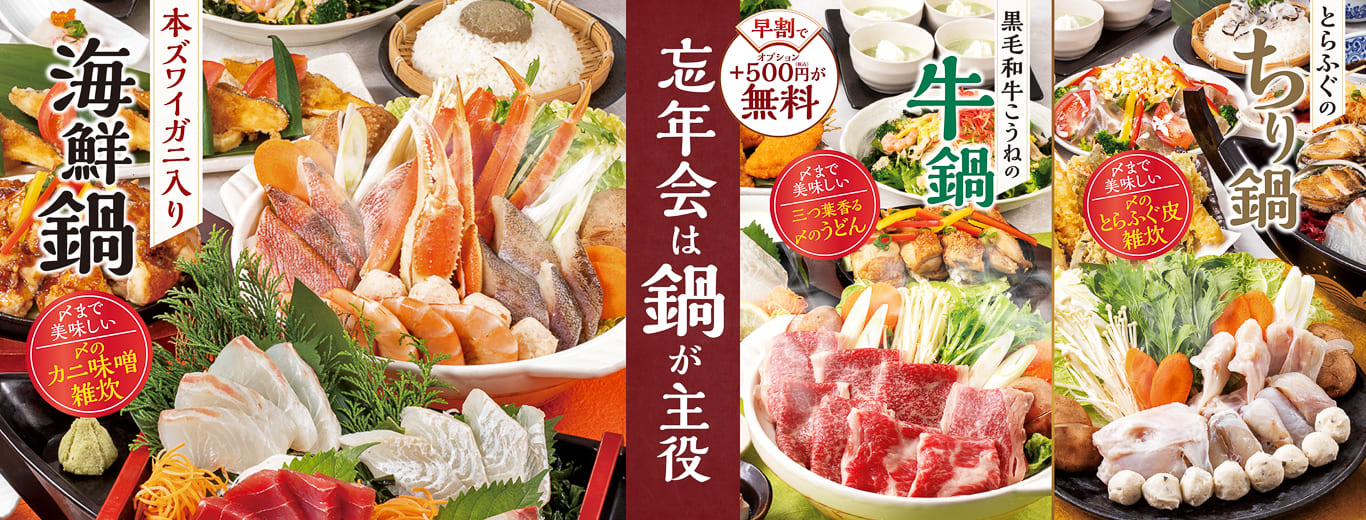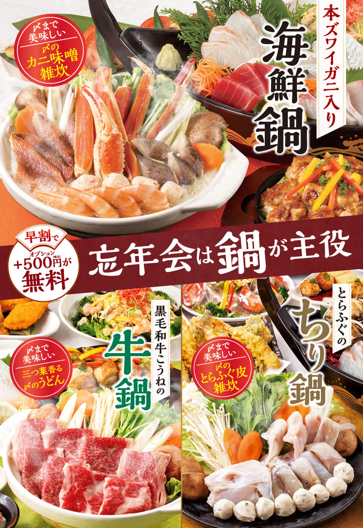 2025年も残り僅か!今年を締めくくる忘年会に〆のカニ味噌雑炊まで美味しい「本ズワイガニ入り海鮮鍋」、豪華「とらふぐのちり鍋」「黒毛和牛こうねの牛鍋」をご用意♪