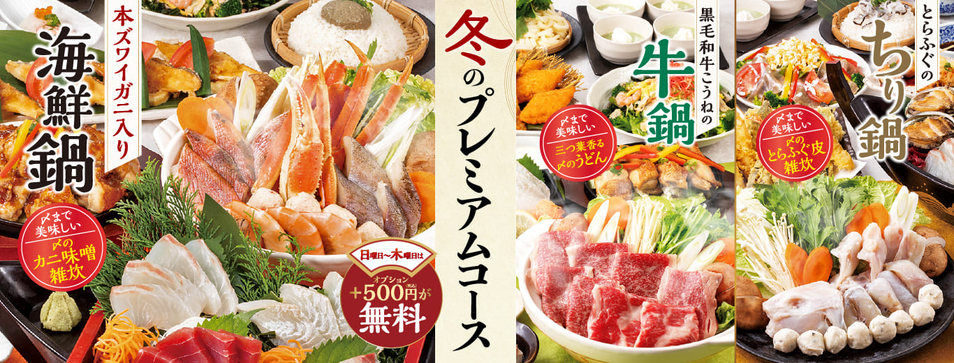 【冬のプレミアムコース】日~木曜「飲放3時間」or「全ドリンク飲放」+500円分の特典が無料!