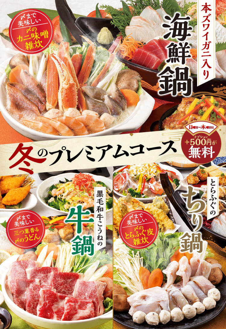 【冬の各種宴会に◎選べる予約特典付】本ズワイガニorとらふぐor黒毛和牛から選べる豪華鍋コース「冬のプレミアム」が4500円~